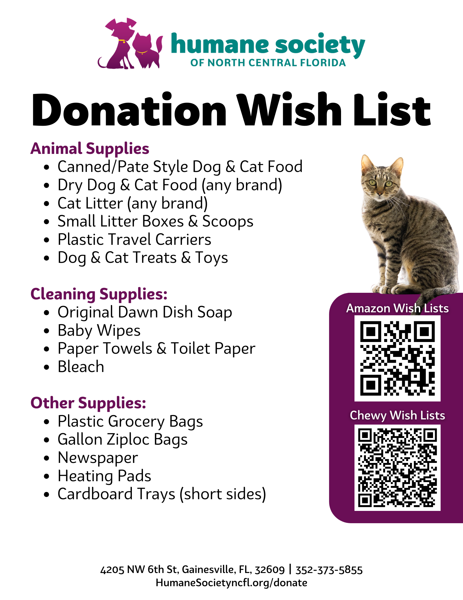 You can support the Humane Society of North Central Florida by shopping our Amazon Wish List and having items shipped directly to our door!