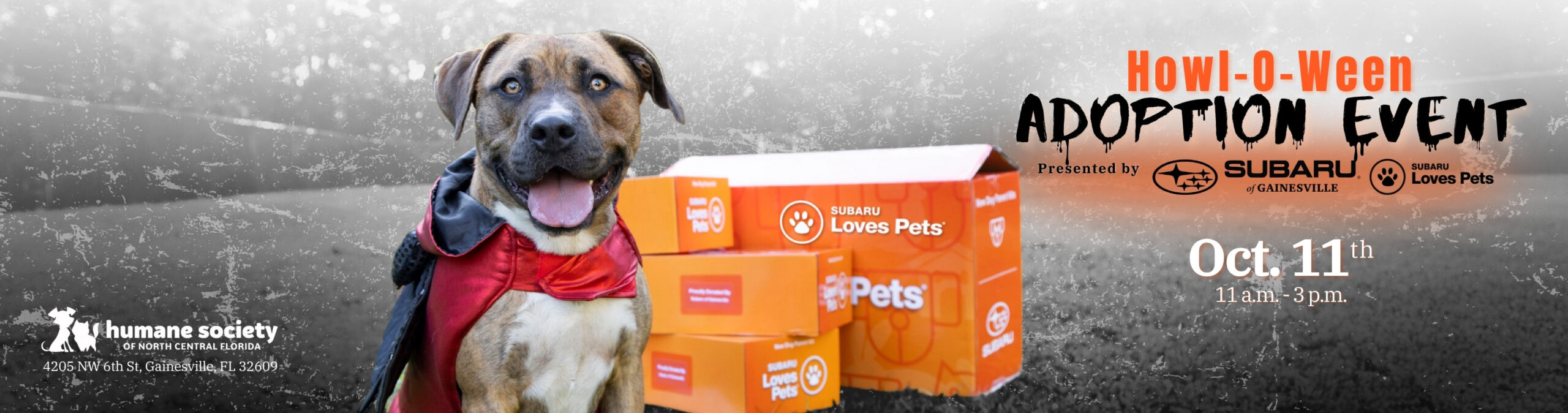 Howl-O-Ween Adoption Event! Join us on Saturday, October 11th, from 11 a.m. to 3 p.m. at the Humane Society of North Central Florida for our Howl-O-Ween Adoption Event, presented by Subaru of Gainesville.